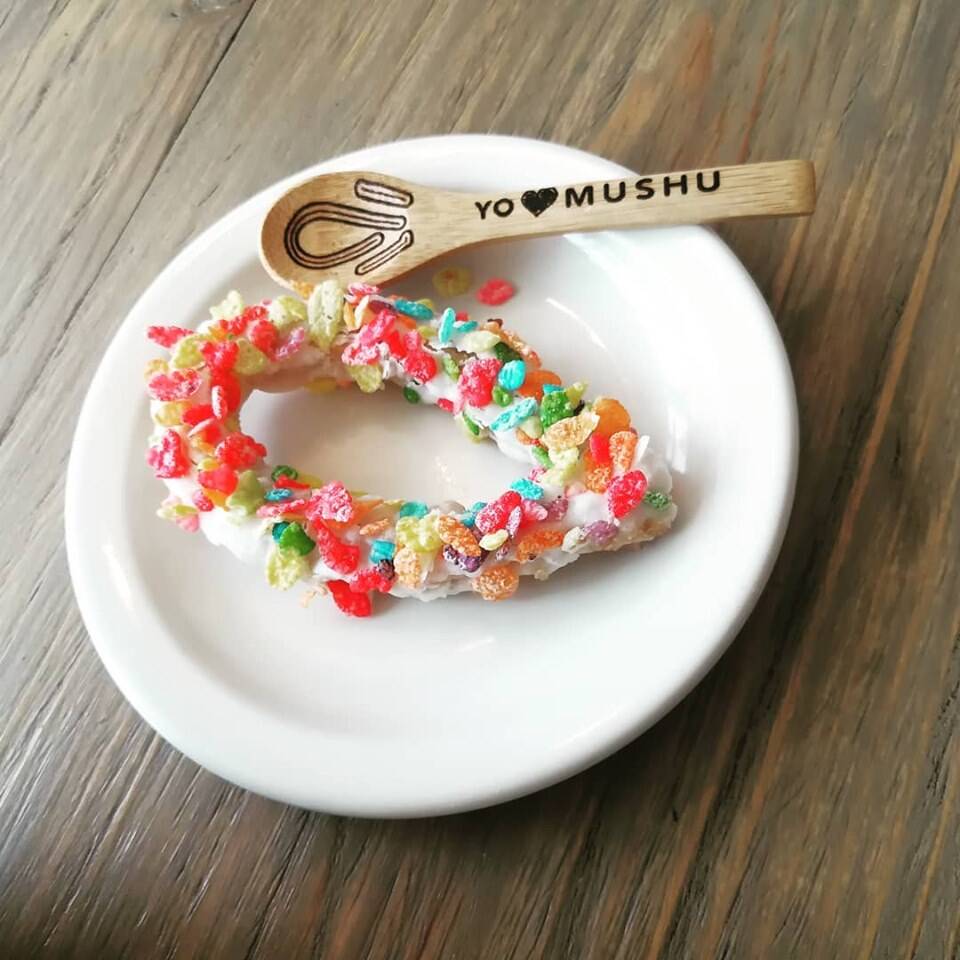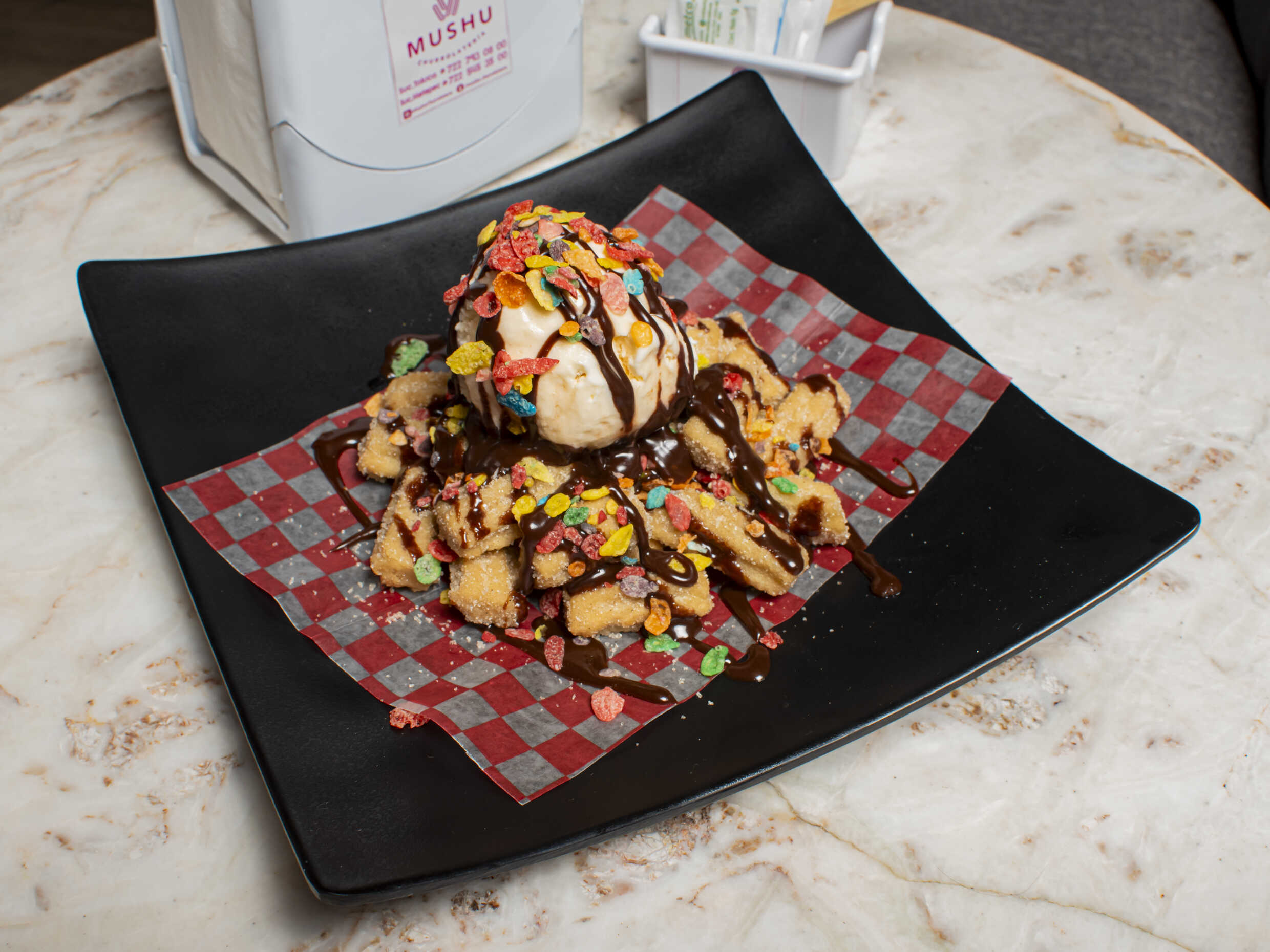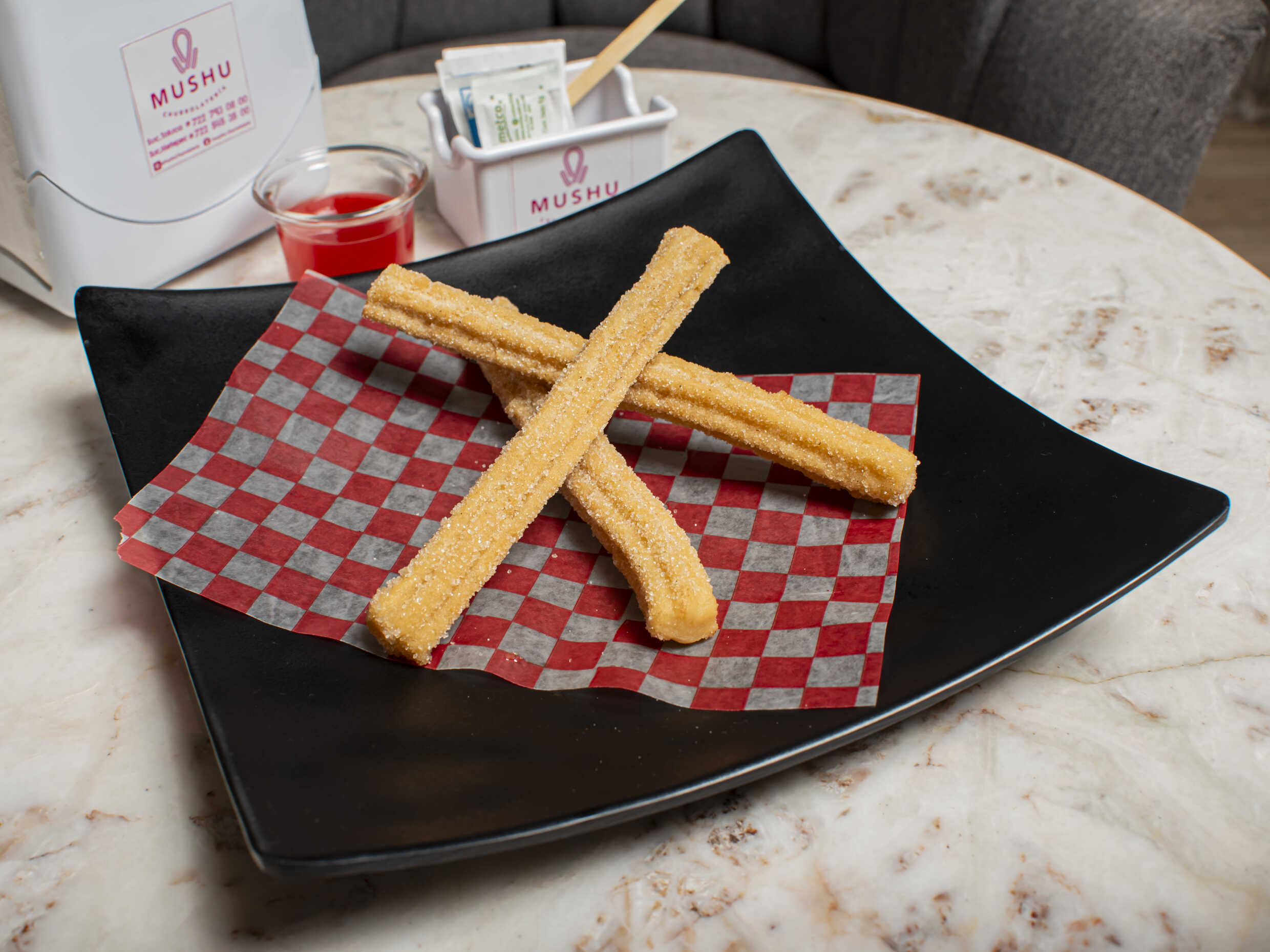 6 mushu donas, 4 O. Clásicos, 3 dips y 6 churros rellenos.
