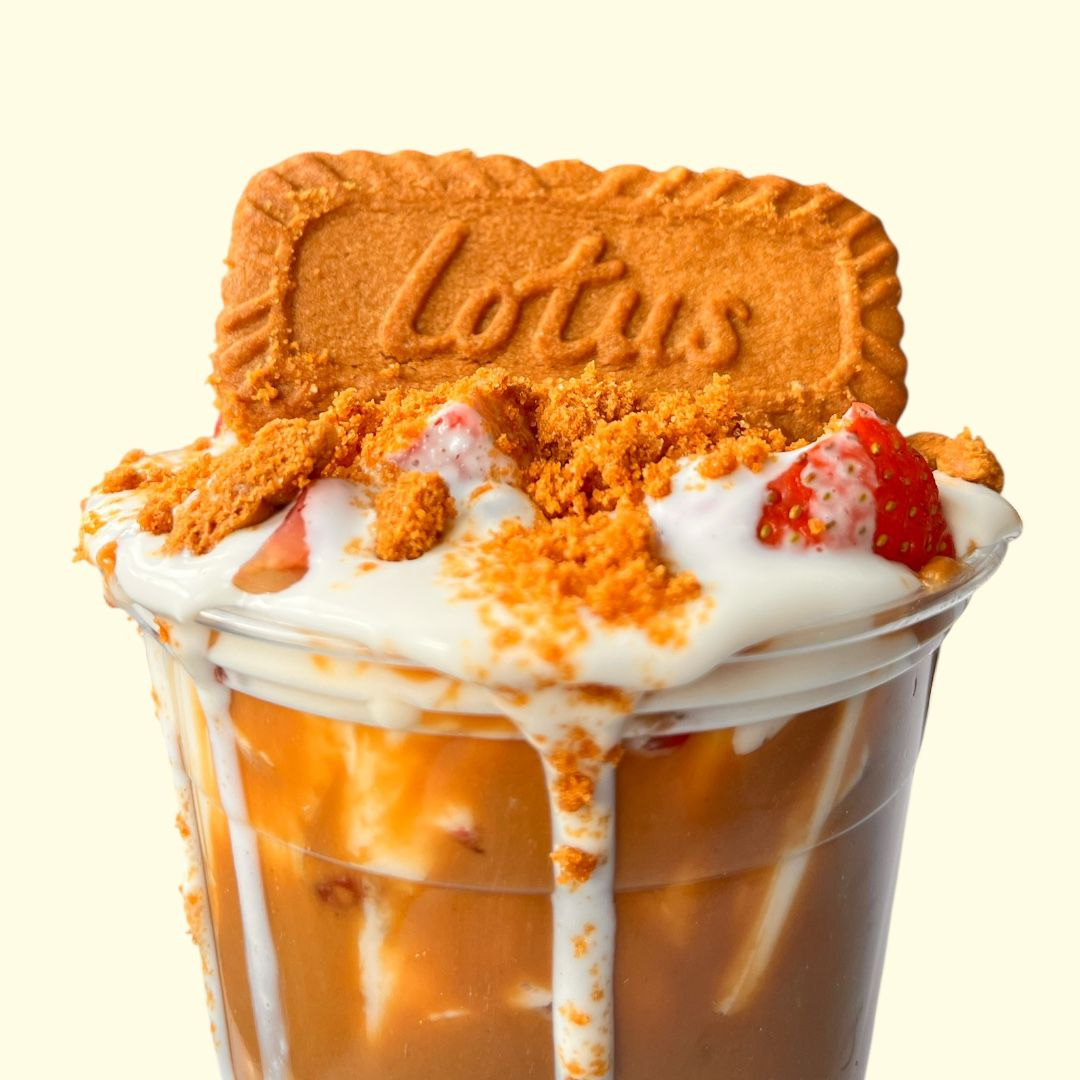 Deliciosas fresas con crema, unatble lotus, galleta lotus molida y una galleta entera. Vaso 12 oz.