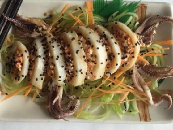 Por dentro surimi y queso filadelpha. Por fuera pulpo bañado con salsa de ajo.