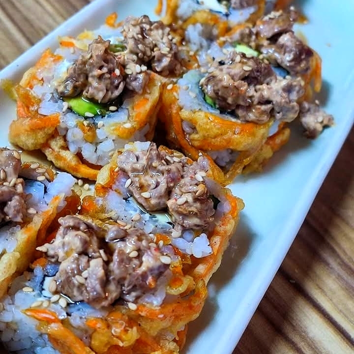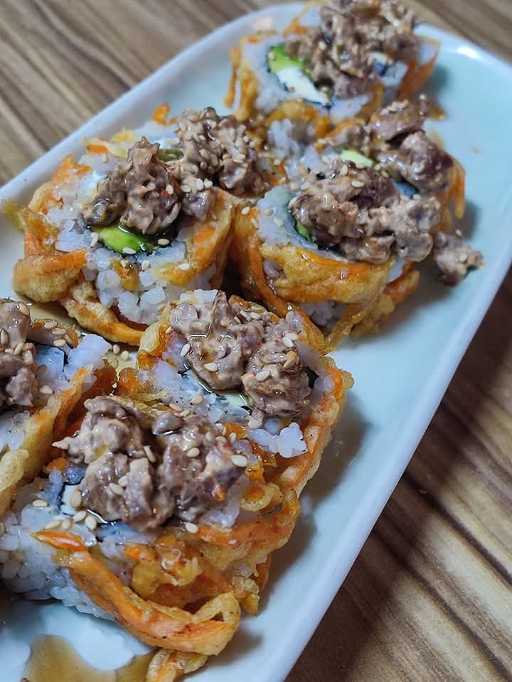Por dentro filadelphia, aguacate y chiles toreados, por fuera kakiage y filete de res con salsa spicy mayo.