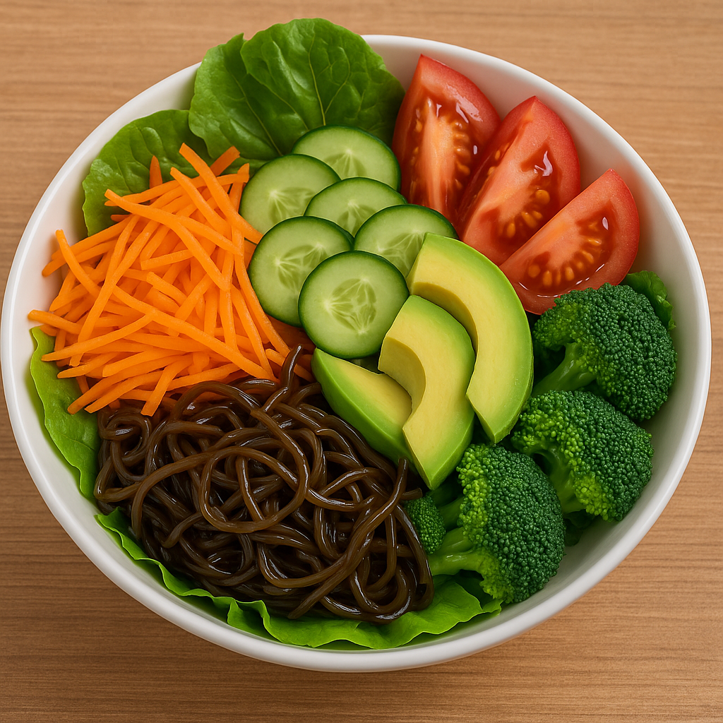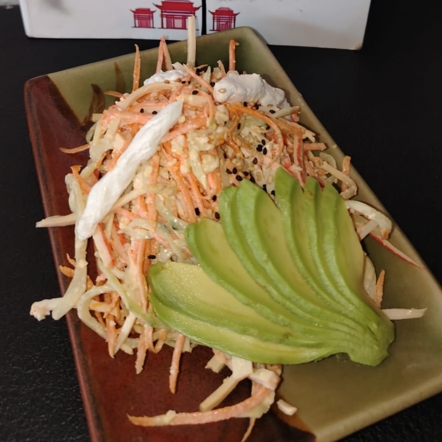 Finas tiras de zanahoria, pepino, aguacate, pimiento, cebolla, mezclados con cangrejo desmenuzado, con aceite de ajonjolí tostado, acompañado con queso filadelphia.