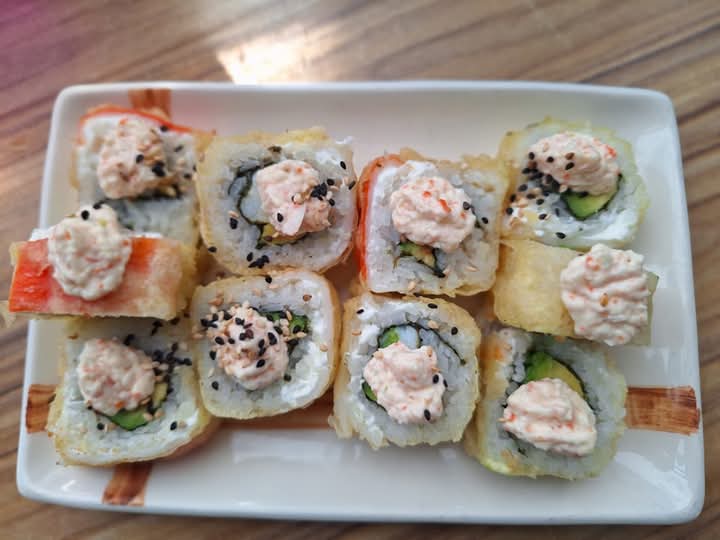 Por dentro queso filadelphia y aguacate, por fuera tempura de kanikama, bañado en salsa de tamarindo.