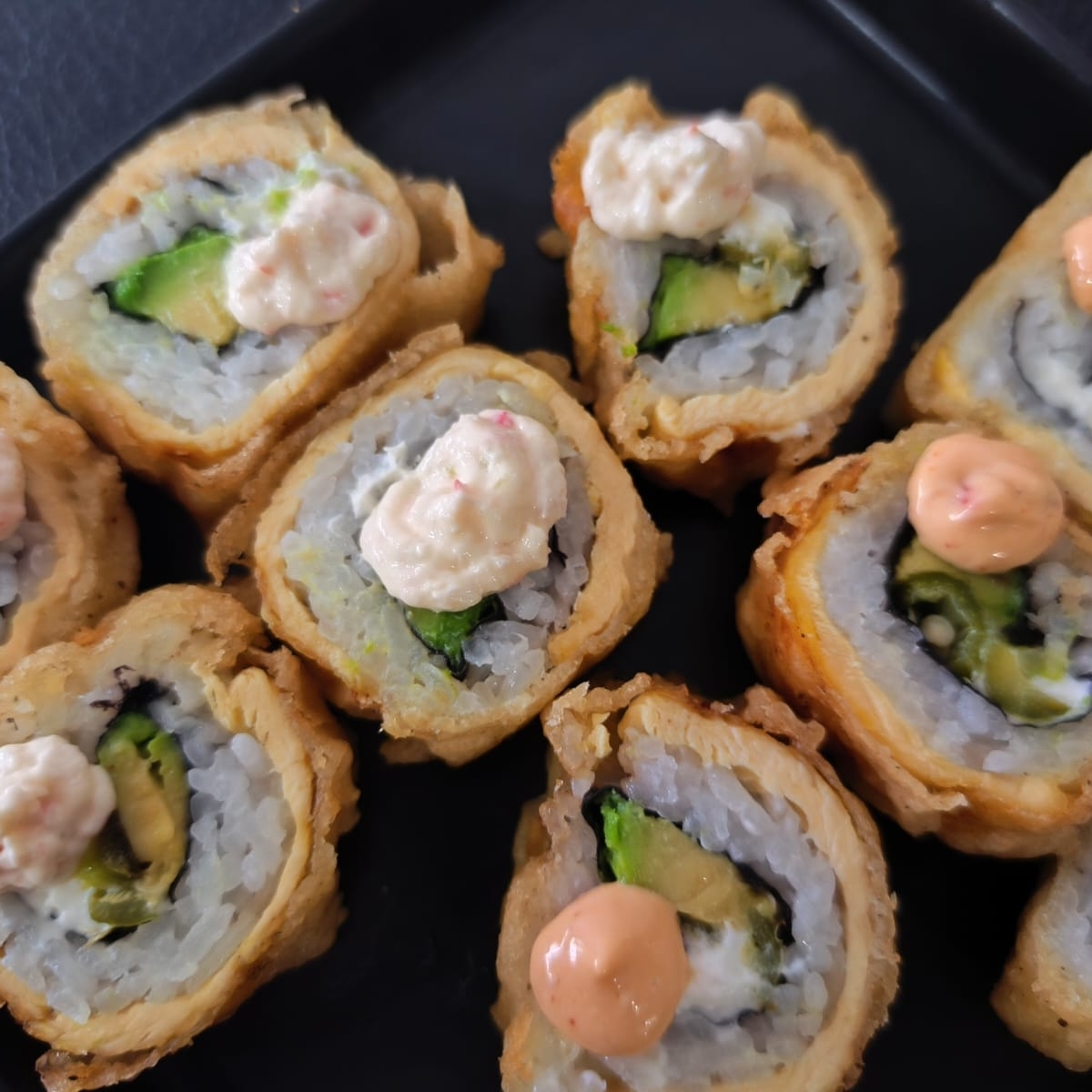Por dentro aguacate, chiles toreados y queso filadelphia, por fuera pollo, salsa tampico y chipotle.