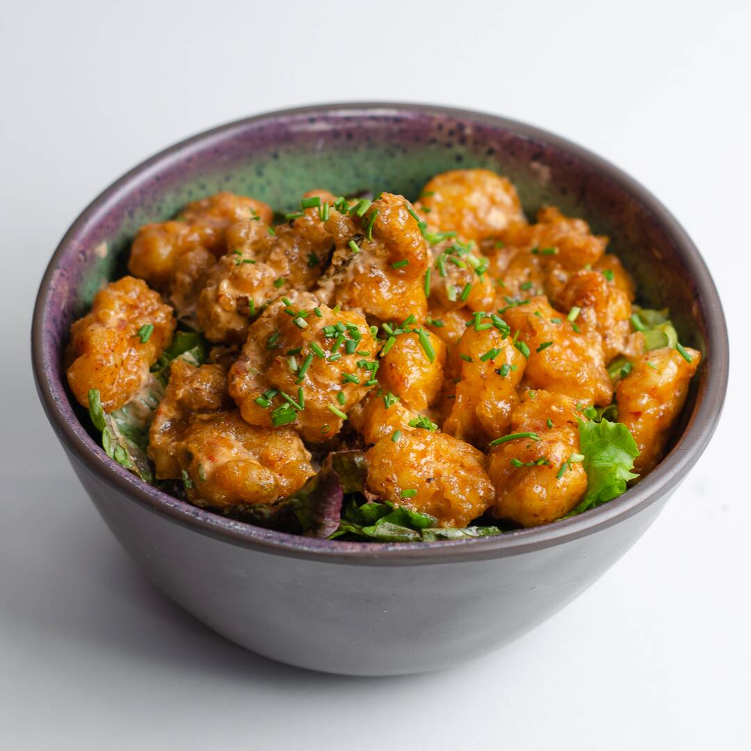 Bites de camarón tempura (100 gramos) bañados en salsa spicy nau y cebollín.