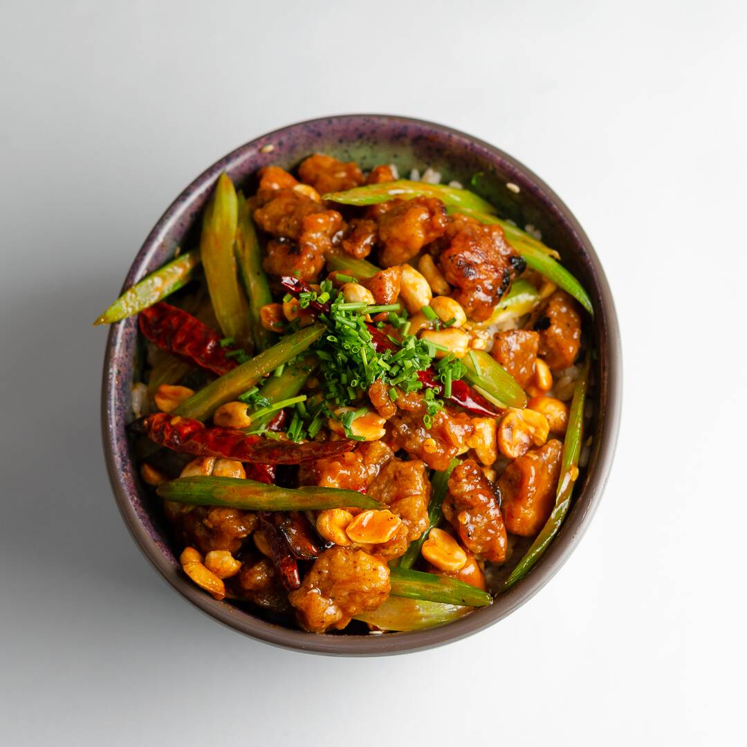 Cubos de pollo (100 gramos) picante con apio, cacahuate y chiles secos en salsa picante estilo sichuan. Todos los woks llevan base a elegir de gohan, yakimeshi o noodles.