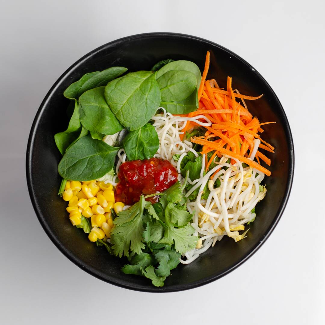 Wok de arroz shari, salmon fresco (50 g), aguacate, pepino, mango, edamames, masago, ajonjolí, salsa spicy y salsa de anguila.