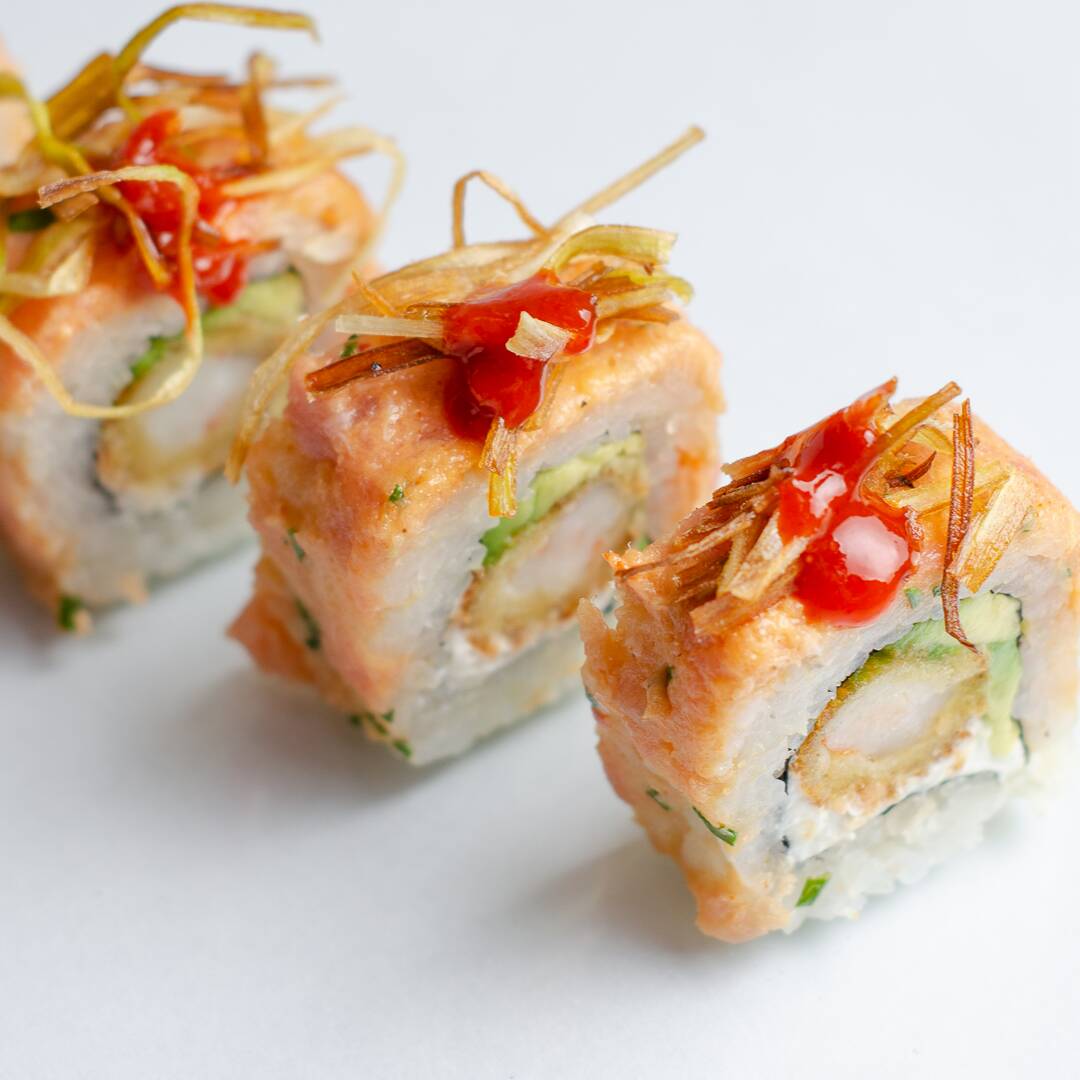 Dentro Camarón empanizado (30g), queso crema y aguacate. Fuera Spicy Tuna, poro frito y salsa sriracha.