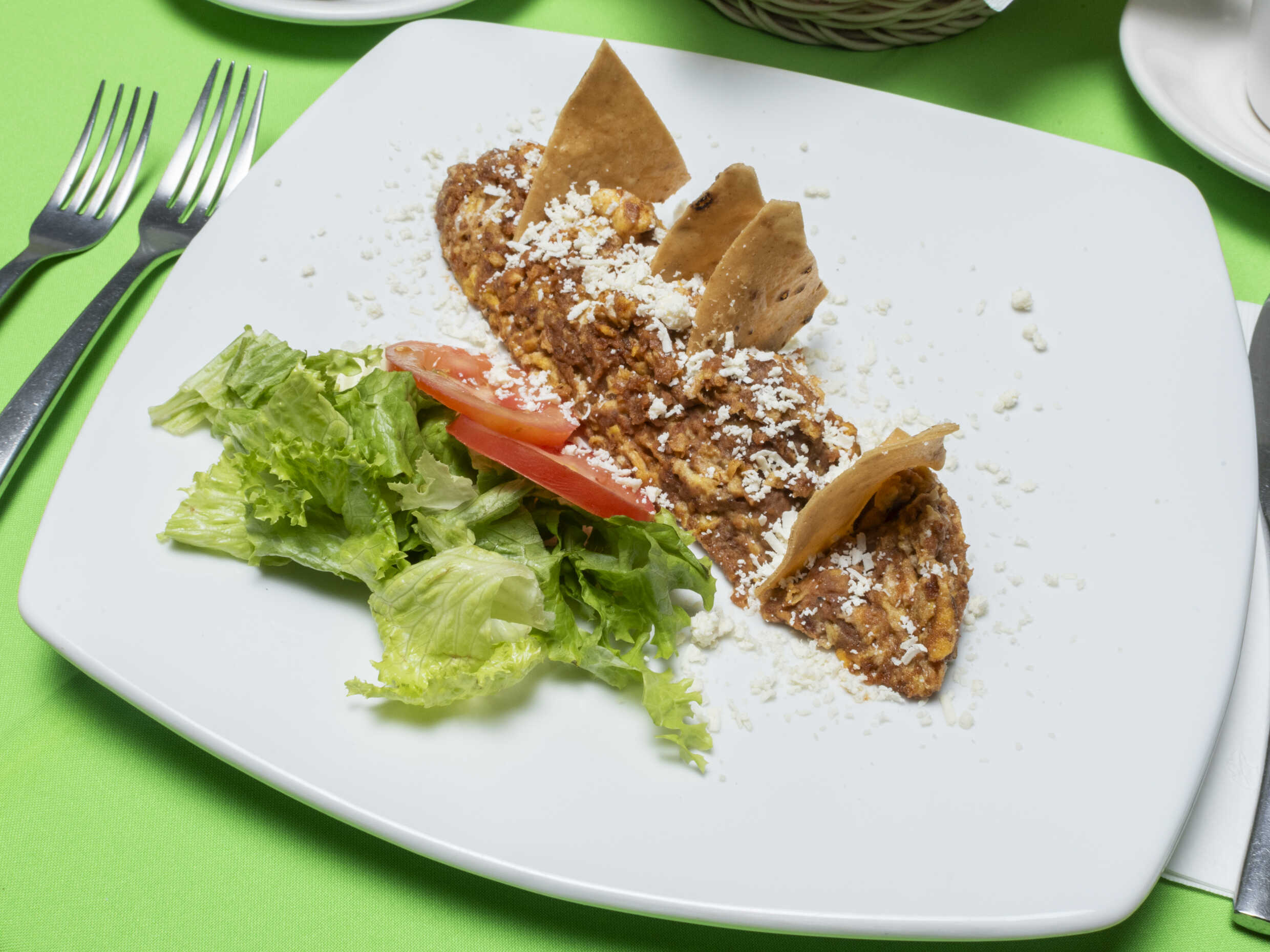Fritos sobre una tortilla de frijol, nopal asado, bañados con salsita verde y queso.