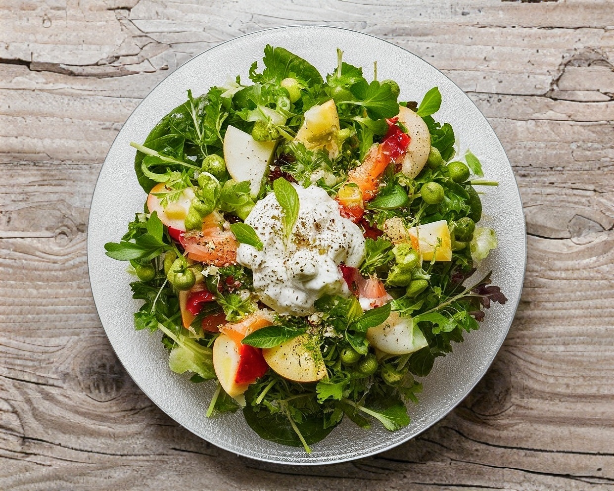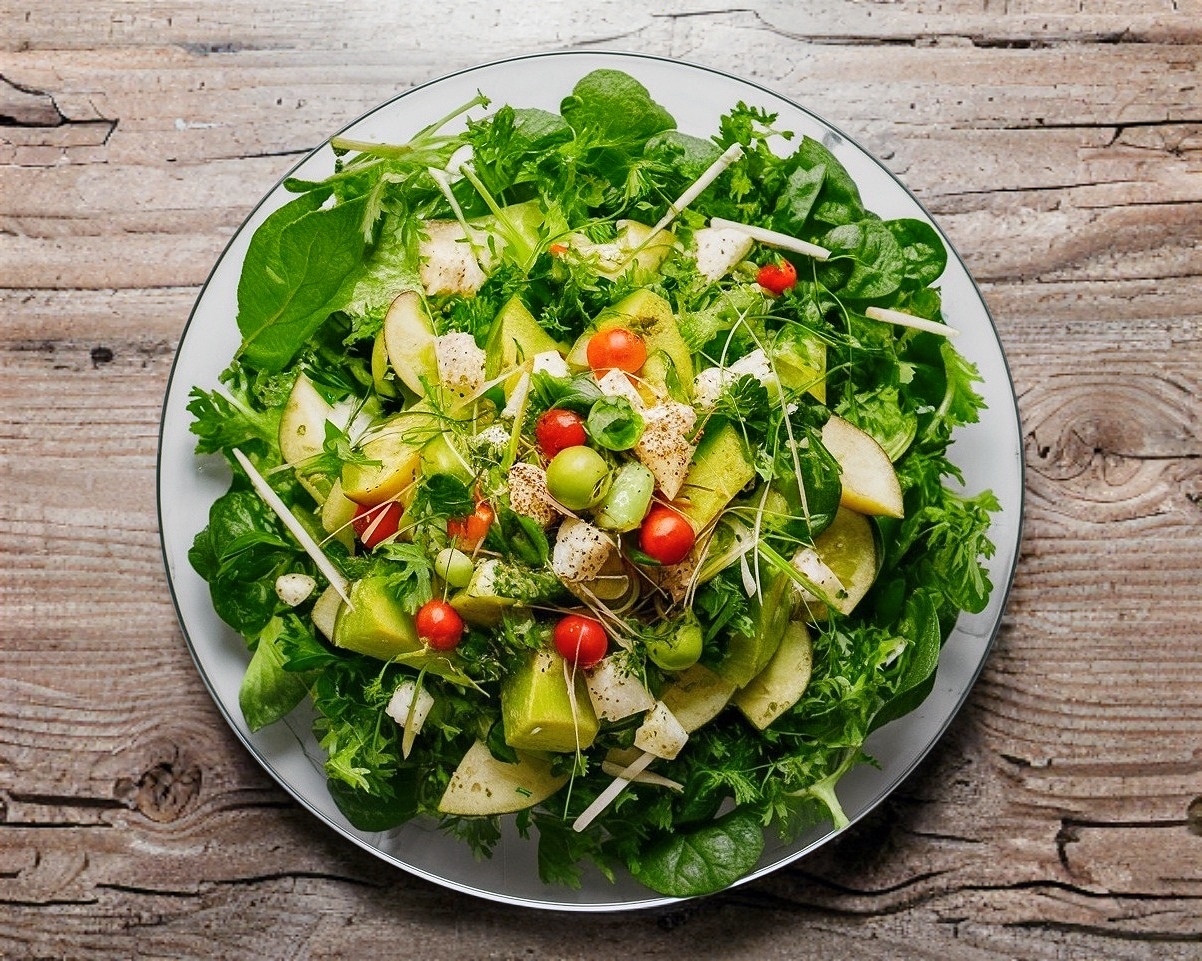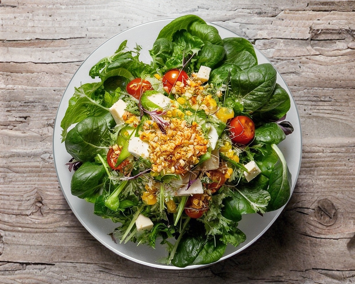 Jitomate cherry, lechuga,espinaca, queso panela y pepino.