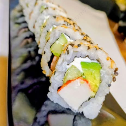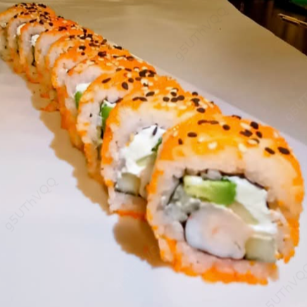Envuelto con masago, relleno de aguacate, queso Philadelphia y pepino, una proteína a escoger.