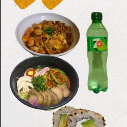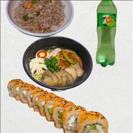 1 Arroz frito mixto (carne, camarón y pollo), 1 ramen de cerdo o pollo, 1 sushi a escoger y 1 refresco o agua 355 ml.
