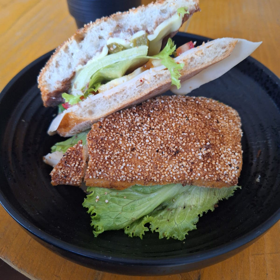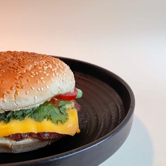 hamburguesa con carne casera rellena de queso Gouda. Mayonesa chipotle, tocino, queso americano, cebolla, jitomate, lechuga, chiles