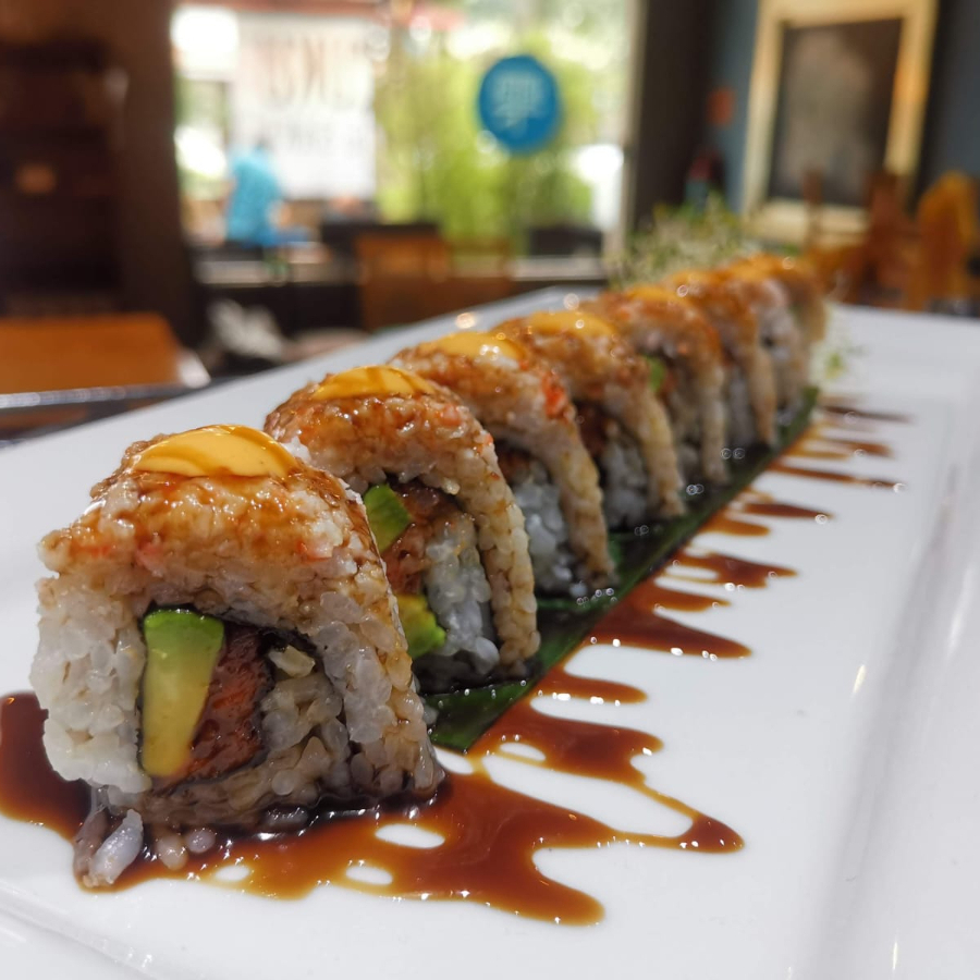 Cangrejo, anguila, aguacate, queso philadelphia, cubierto con salsa de anguila
