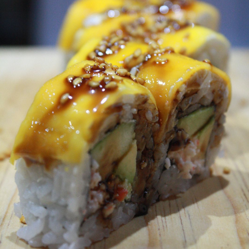 Cangrejo, aguacate y pepino, cubierto con queso philadelphia, mango y salsa de alguila