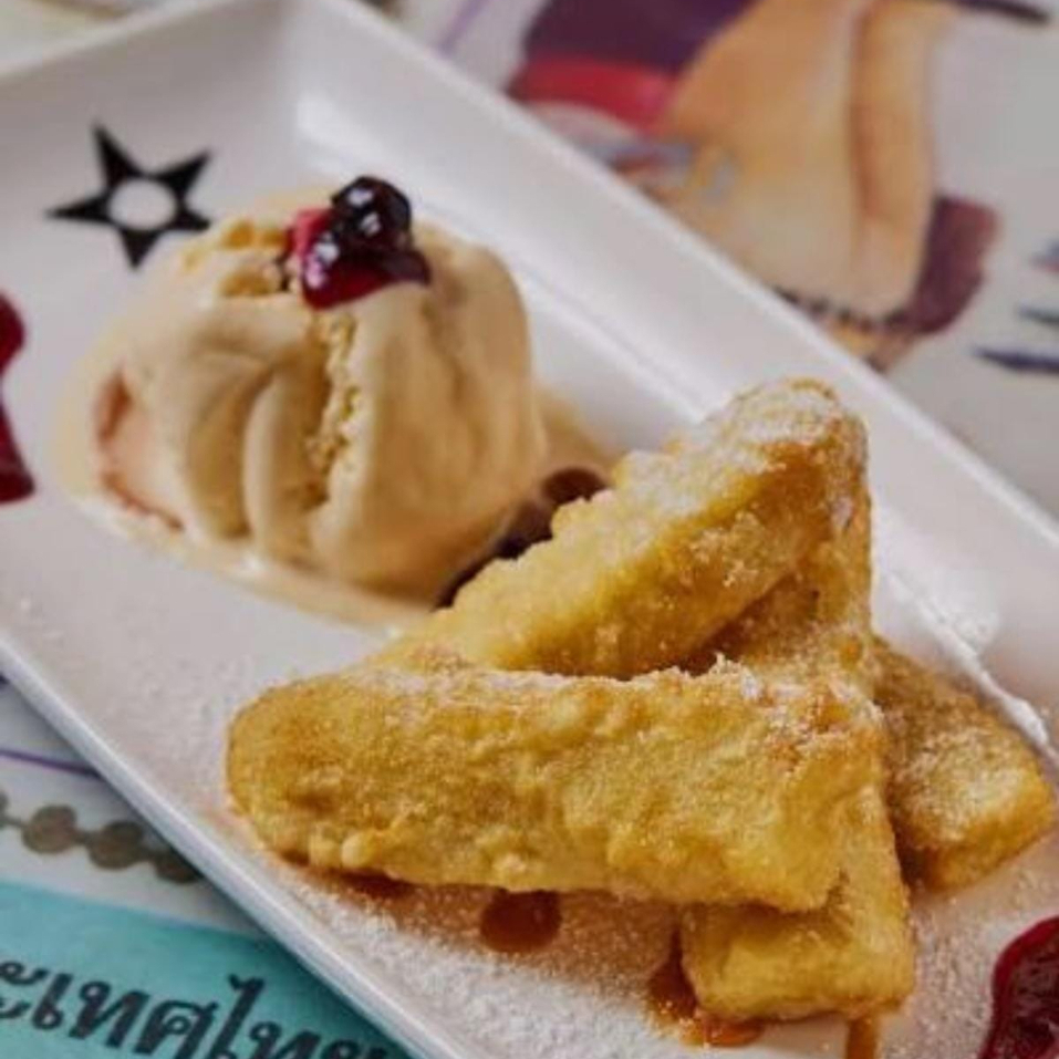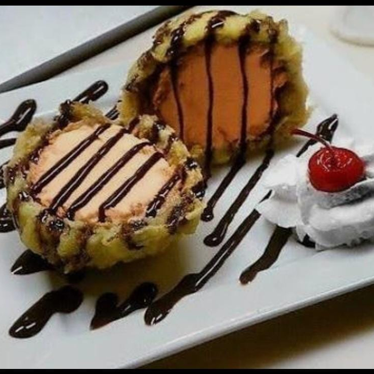 Bola de helado envuelto con panque frito en tempura