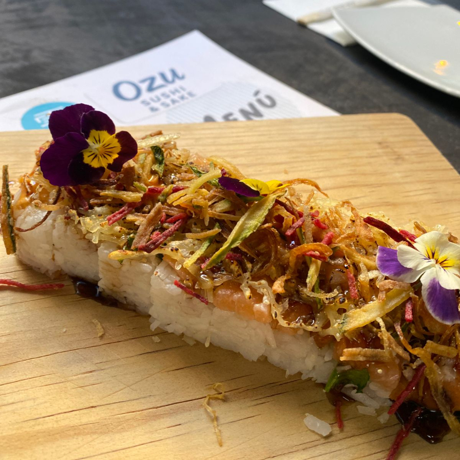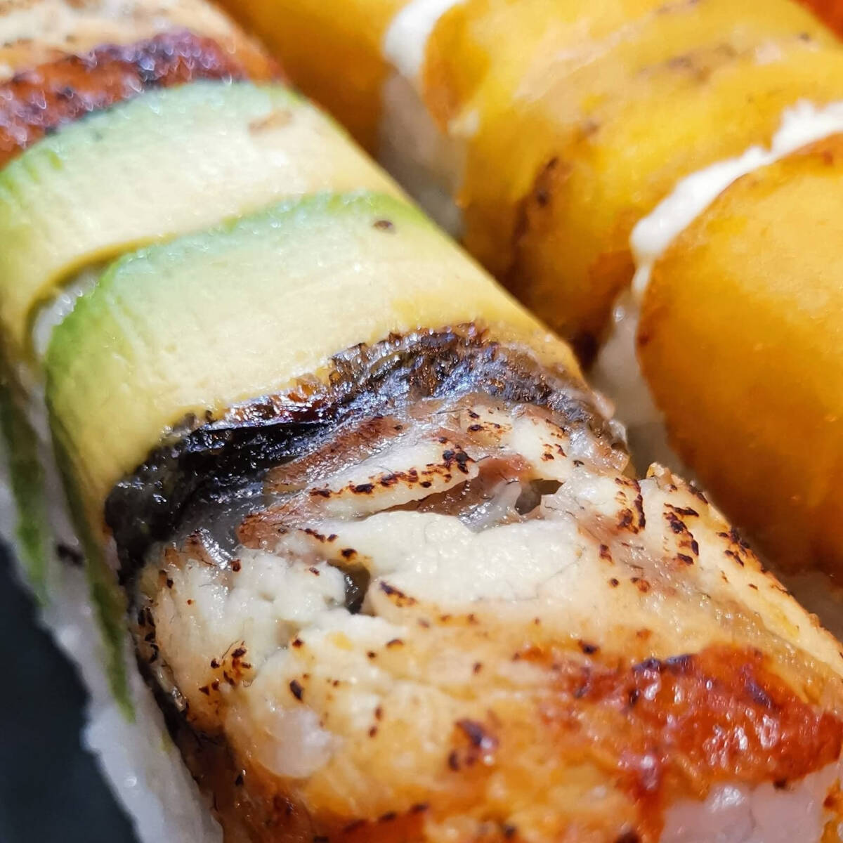 Salmón, queso philadelphia y pepino, cubierto de aguacate, salsa de mango y gotas de sriracho
