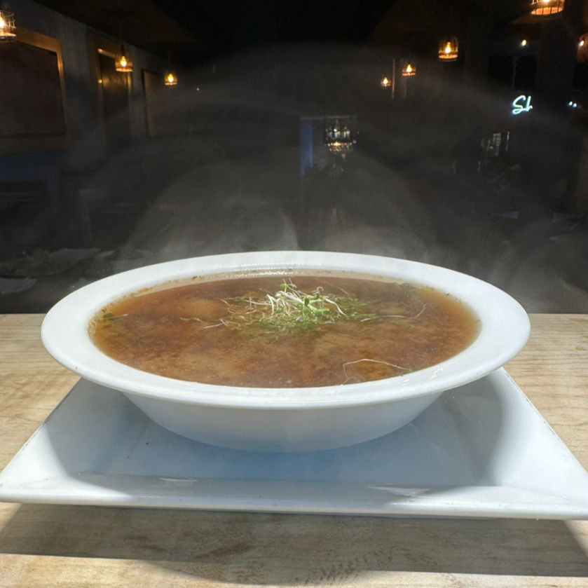 Caldo con algas, fideo chino, hongo shitake, tofu, wakame y cebollín