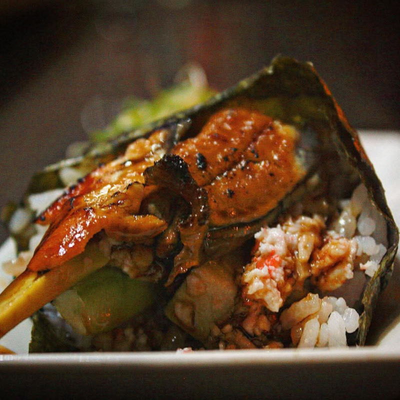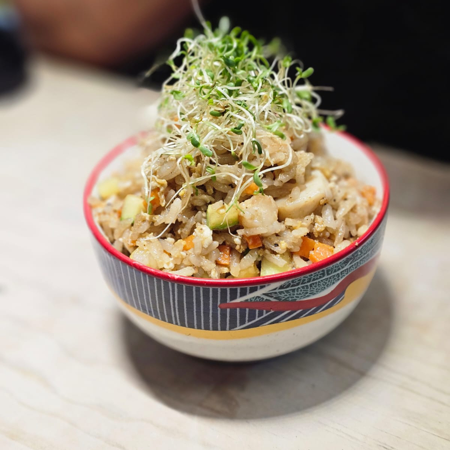 Arroz frito en mantequilla de ajo, con laminas de ajo, aceite de trufa, surimi, camarón, callo de almeja, calamar, pollo, res, huevo, cebollín, calabaza y zanahoria