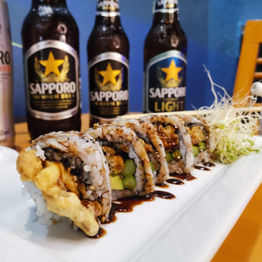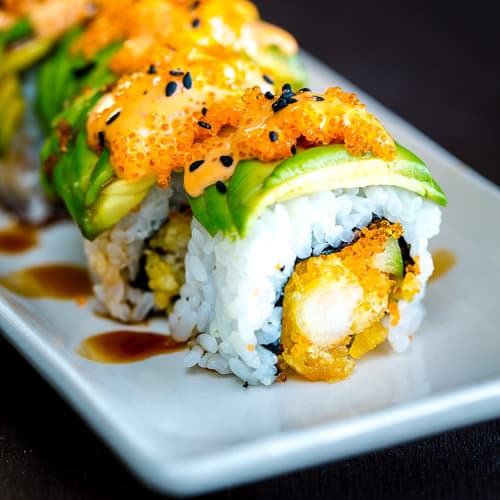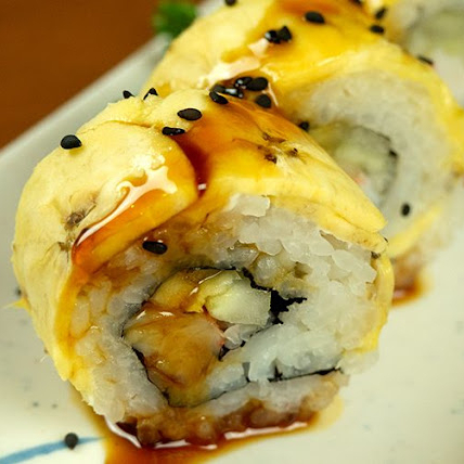 5 pz, camarón, tempura, aguacate y pepino, cubierto con salsa de anguila y crujiente de témpura