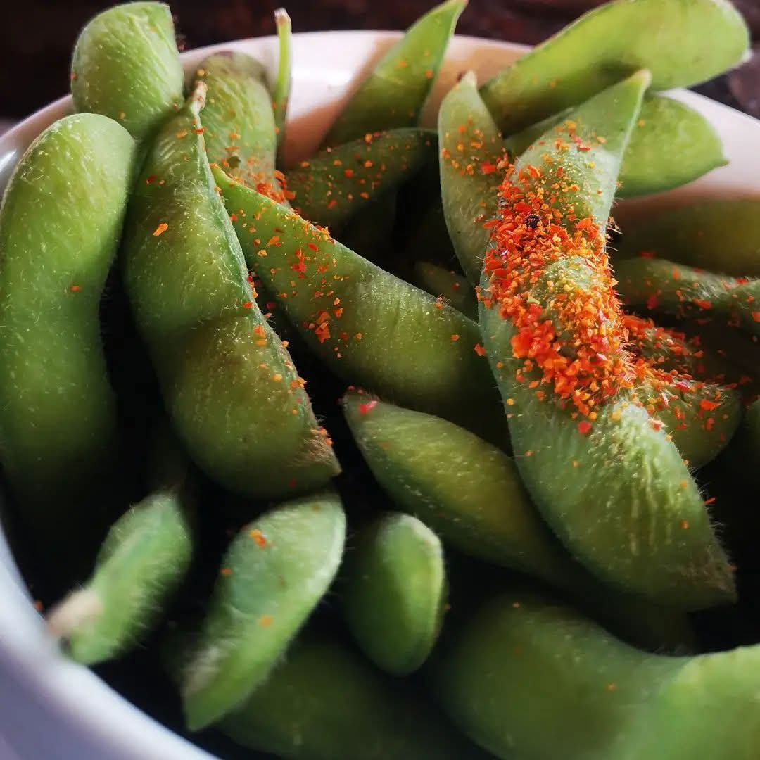 Frijol de soya cocinado al vapor con sal marina o asados con shichimi