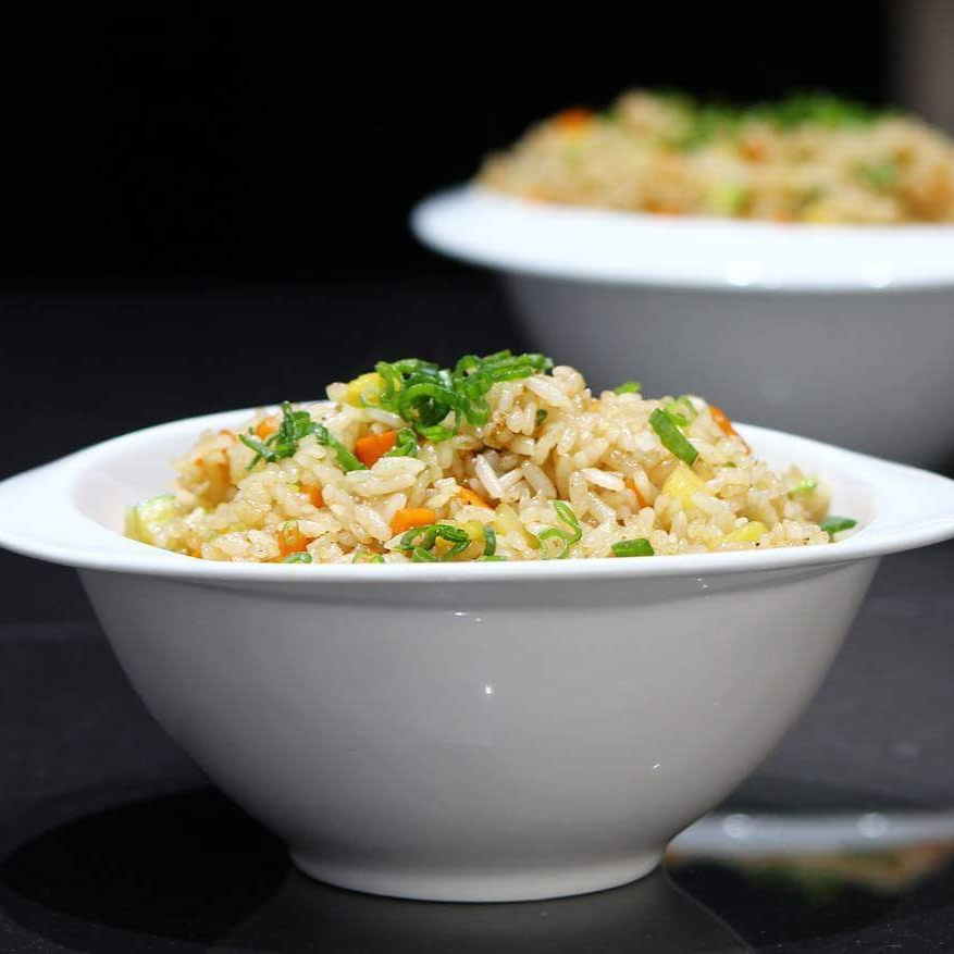 Arroz frito con cebolla, calabaza, zanahoria y salsa de ostión
