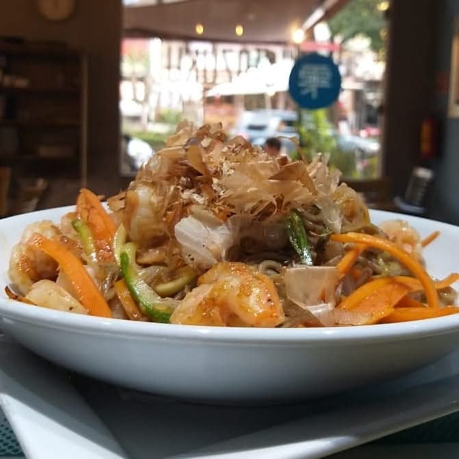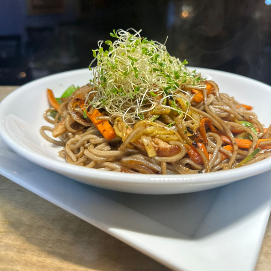 Fideos saba o udon asados con calabaza, cebolla, zanahoria, chícharo japones y salsa de ostión