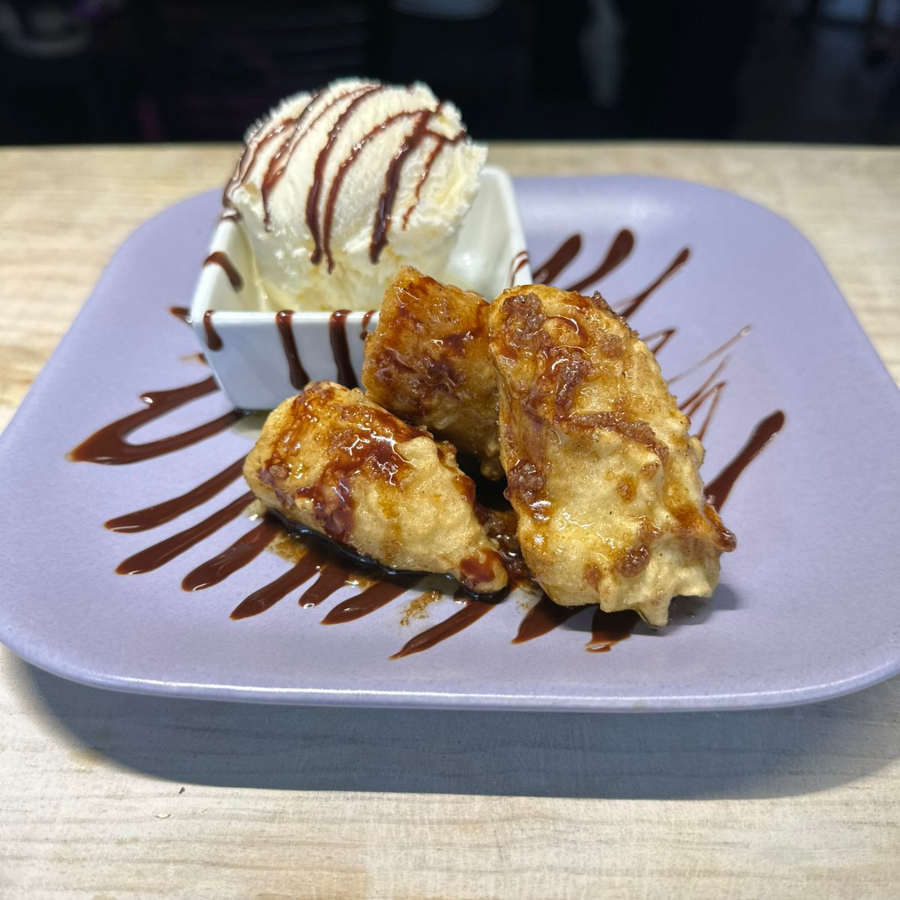 Plátano con tempura flameado con licor de café, acompañado con helado de vainilla