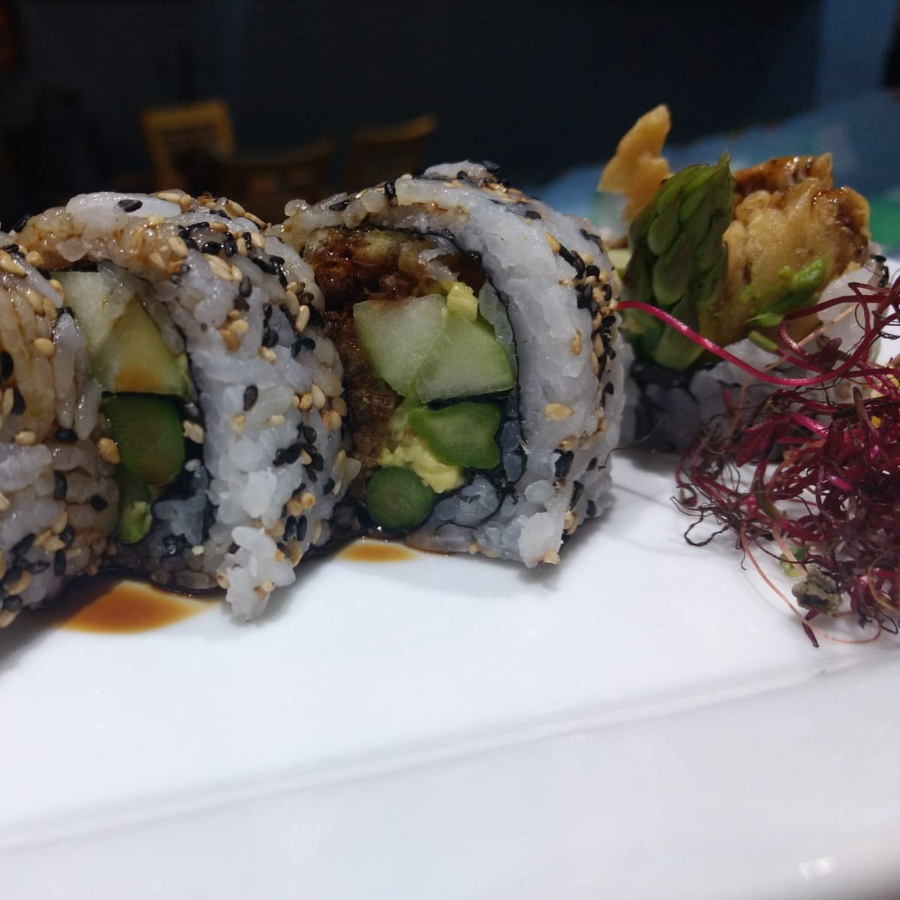 Aguacate, pepino, esparrago, yamagobo y daikon con salsa de anguila