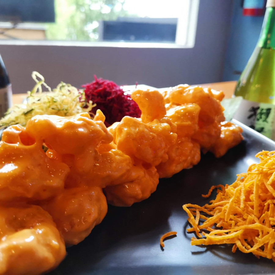 150grms de camarón en témpura bañados de spicy mayo acompañados de mix de lechuga