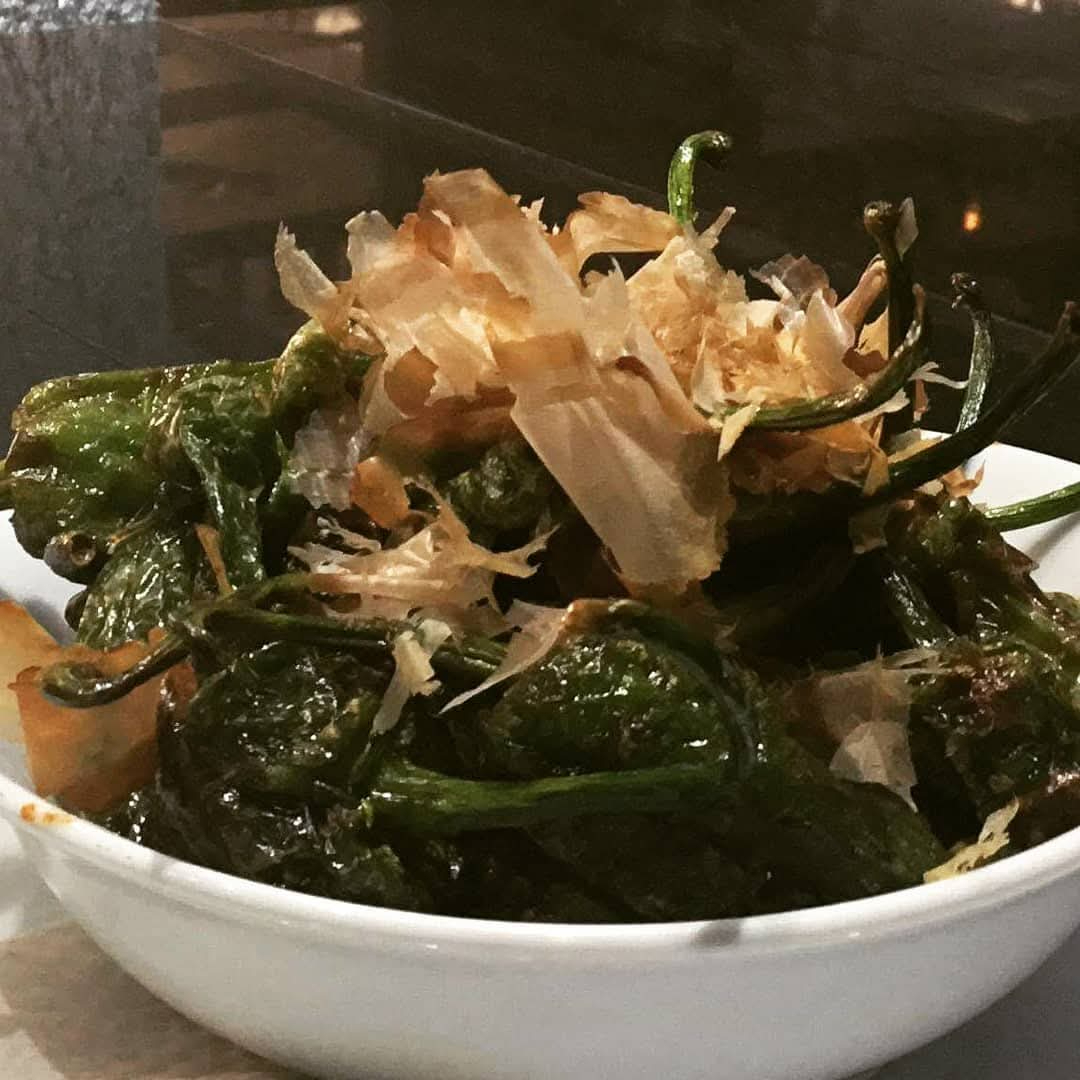 Pimiento japones salteado con salsa de soya y mantequilla, con ojuelas de pescado bonito