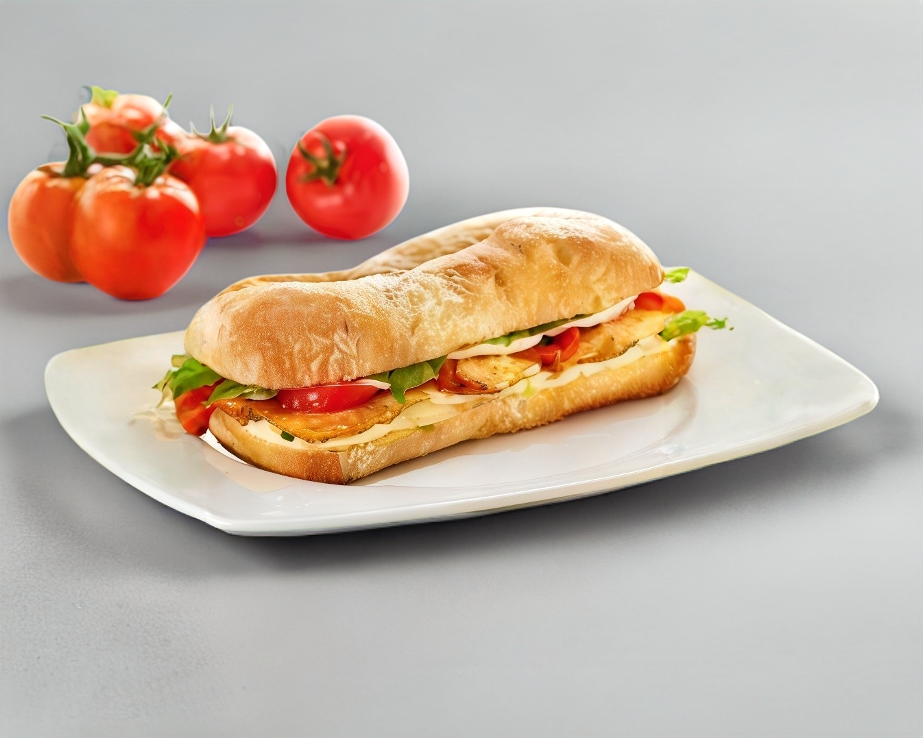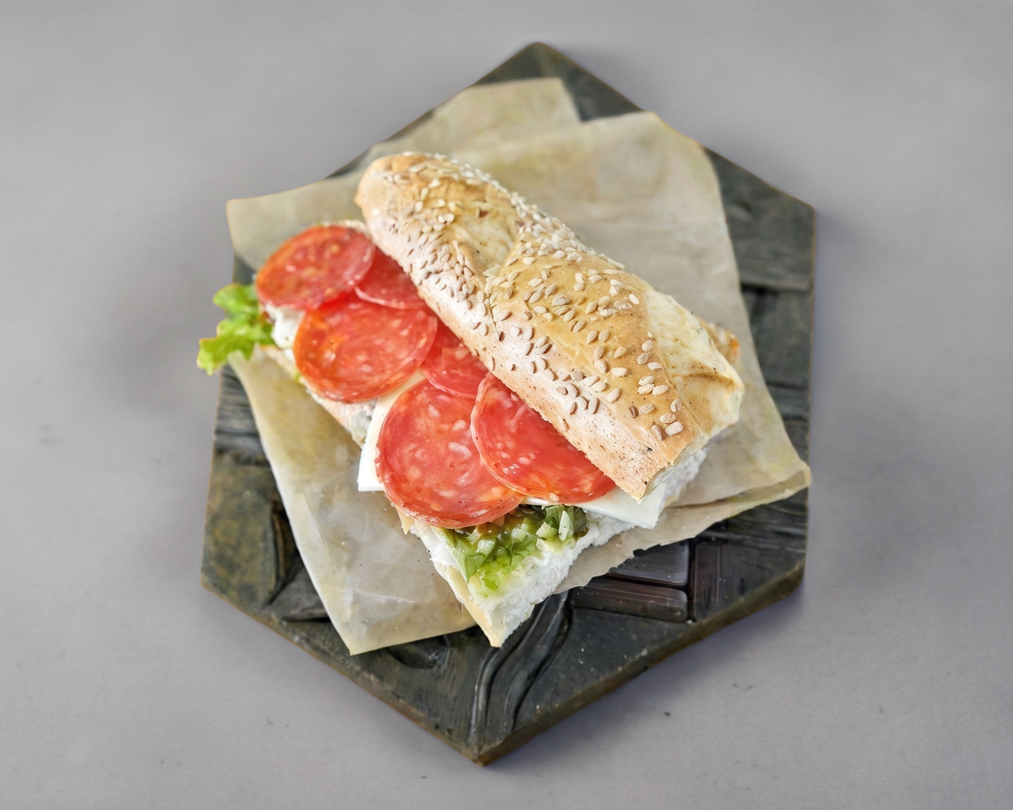Pan de masa madre elaborado a mano, incluye pimiento fresco, lechuga, jitomate y queso, acompañado con papitas y chiles en vinagre.