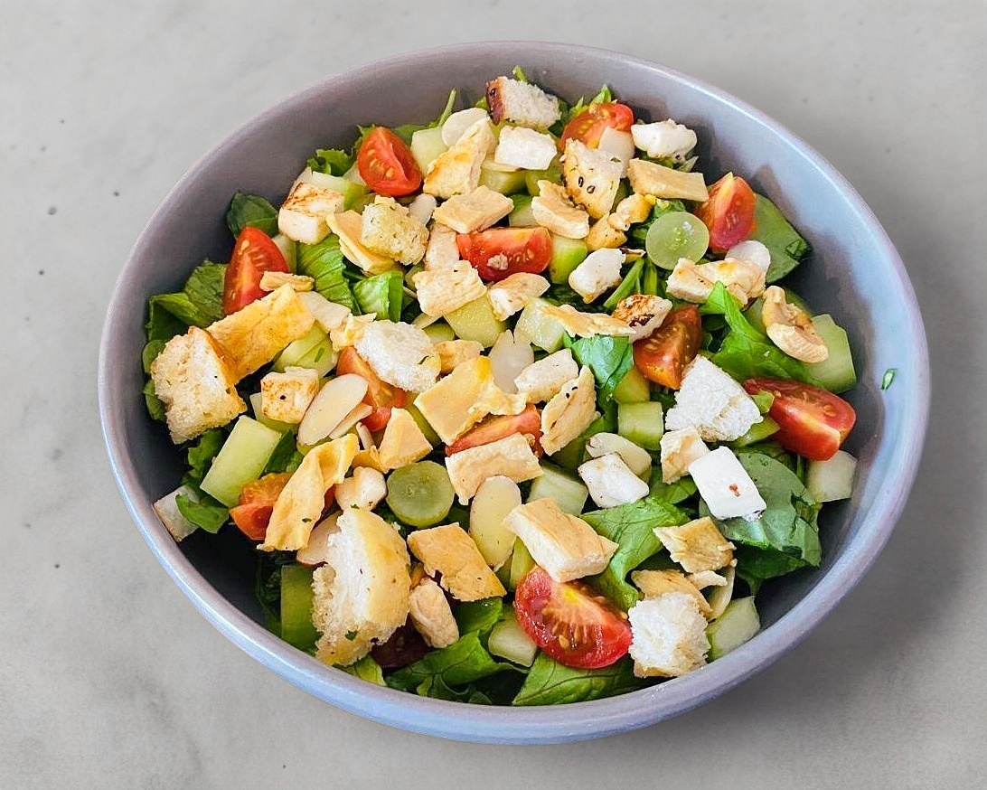 Mezcla de lechuga y espinaca, uva verde, pepino, jitomate cherry, almendras, queso panela asado y pollo a la parrilla y aderezo.