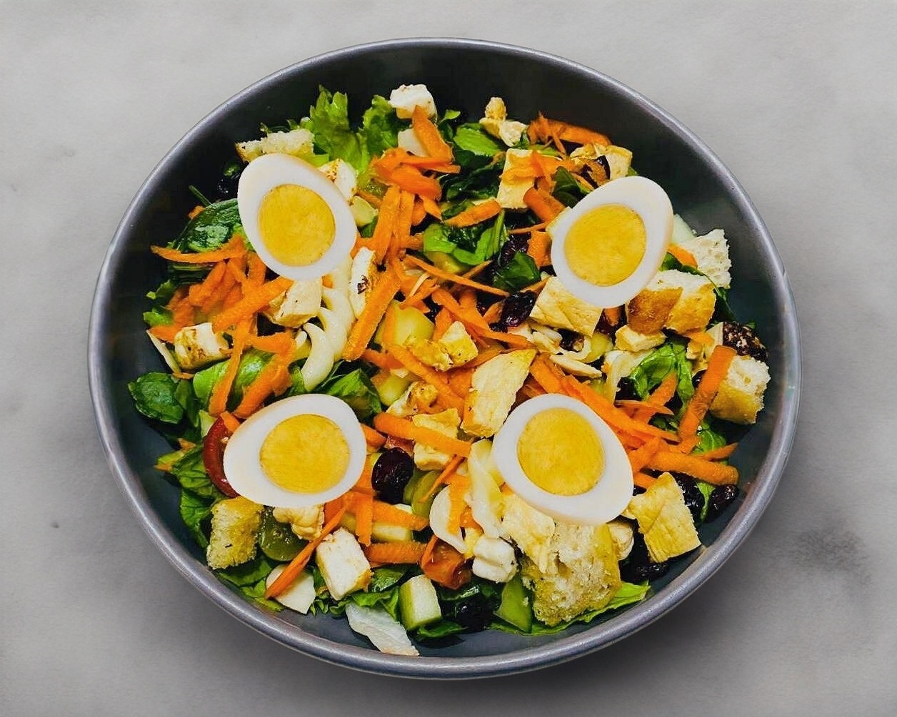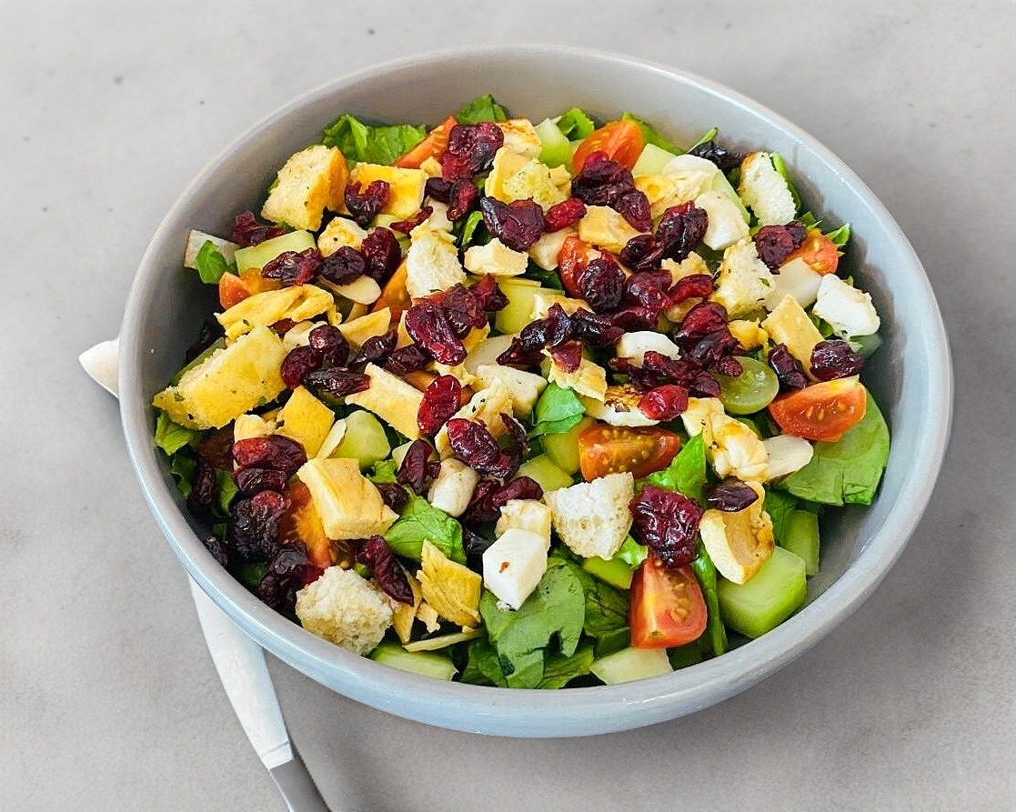 Mezcla de lechuga y espinaca, manzana, pepino, jitomate cherry, cacahuate, arándano y pollo empanizado y aderezo.