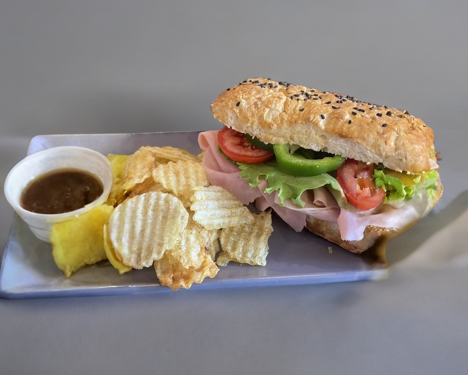 Croissant danes hecho a mano, incluye pimiento fresco, lechuga, jitomate y queso, acompañado con papitas.