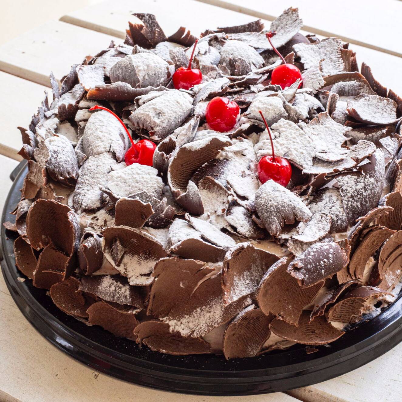 Pastel Envinado con Brandy, relleno de crema de nata con cereza, decorado con hojuelas de chocolate.