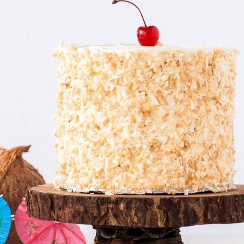 Suave biscocho de vainilla hidratado con una suave mezcla de tres leches relleno de trocitos de piña cubierto con yogurt y espolvoreado con coco horneado con coco horneado.