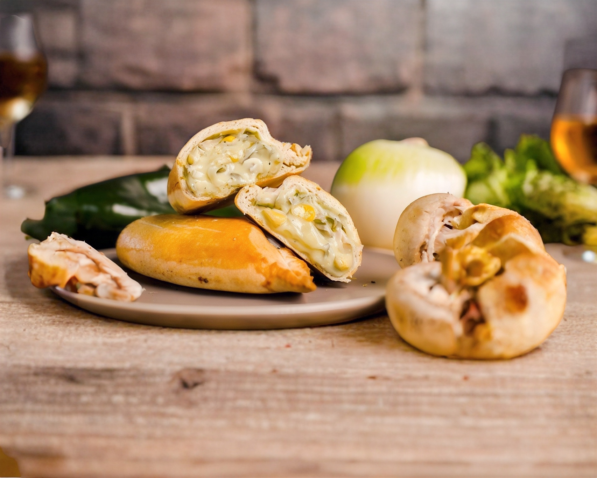 Empanada de Champiñones con crema, rajas y granos de elote que te conquistará por ser tan especial. Hecha en masa tradicional.