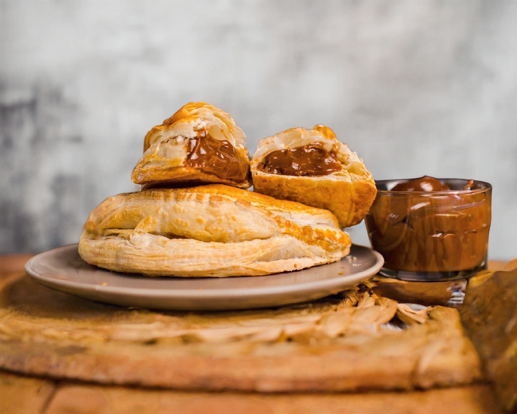Empanada de masa de hojaldre rellena con cajeta y nuez, un sabor único.