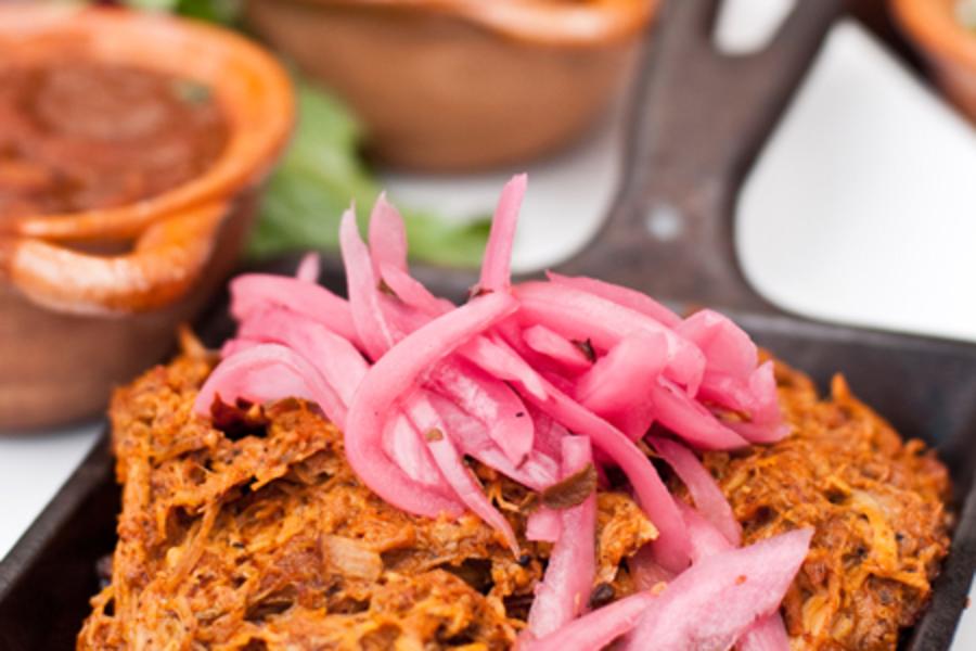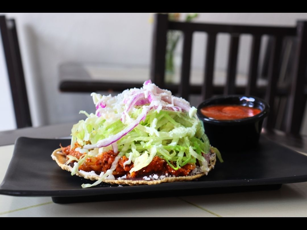 Base de frijol, guisado, cebolla morada, jitomate y aguacate (cochinita sólo con cebolla morada y frijoles)