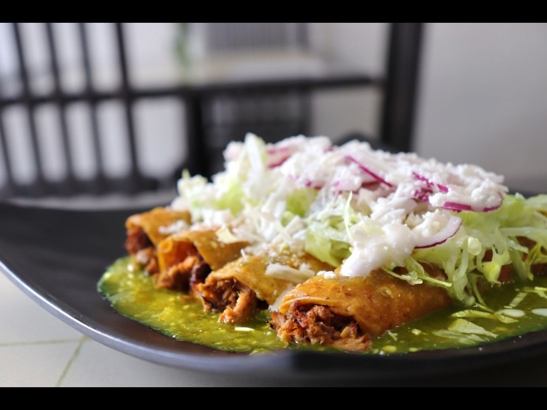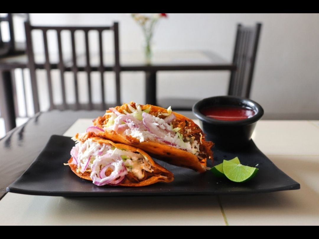 Taco semi dorado con la grasita de la cochinita. Preparada con lechuga, crema, queso y cebolla morada (EXCLUSIVAMENTE de cochinita pibil)