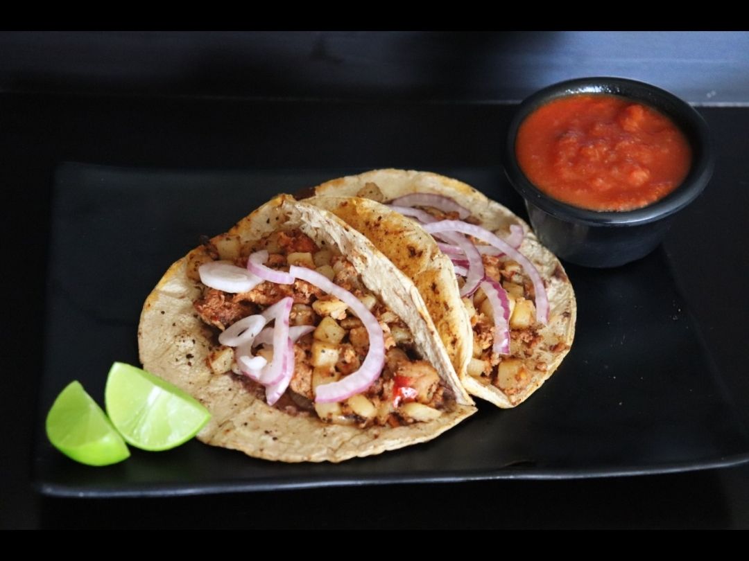 Dos tortillas de maíz, base de frijoles el guisado de tu elección y cebolla morada.