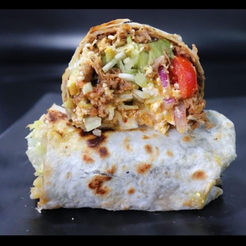 Tortilla de harina grande preparado con frijoles, jitomate, aguacate, cebolla morada, lechuga, crema y queso. Partido por la mitad. Pieza de aprox. 25cm.