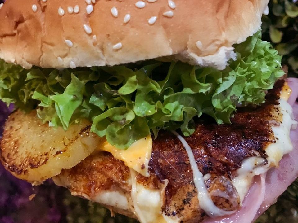 150 gr. de carne de res preparada, mix de quesos , jamon, tocino, piña asada, fritura de la casa , BBQ, mayonesa y verdura