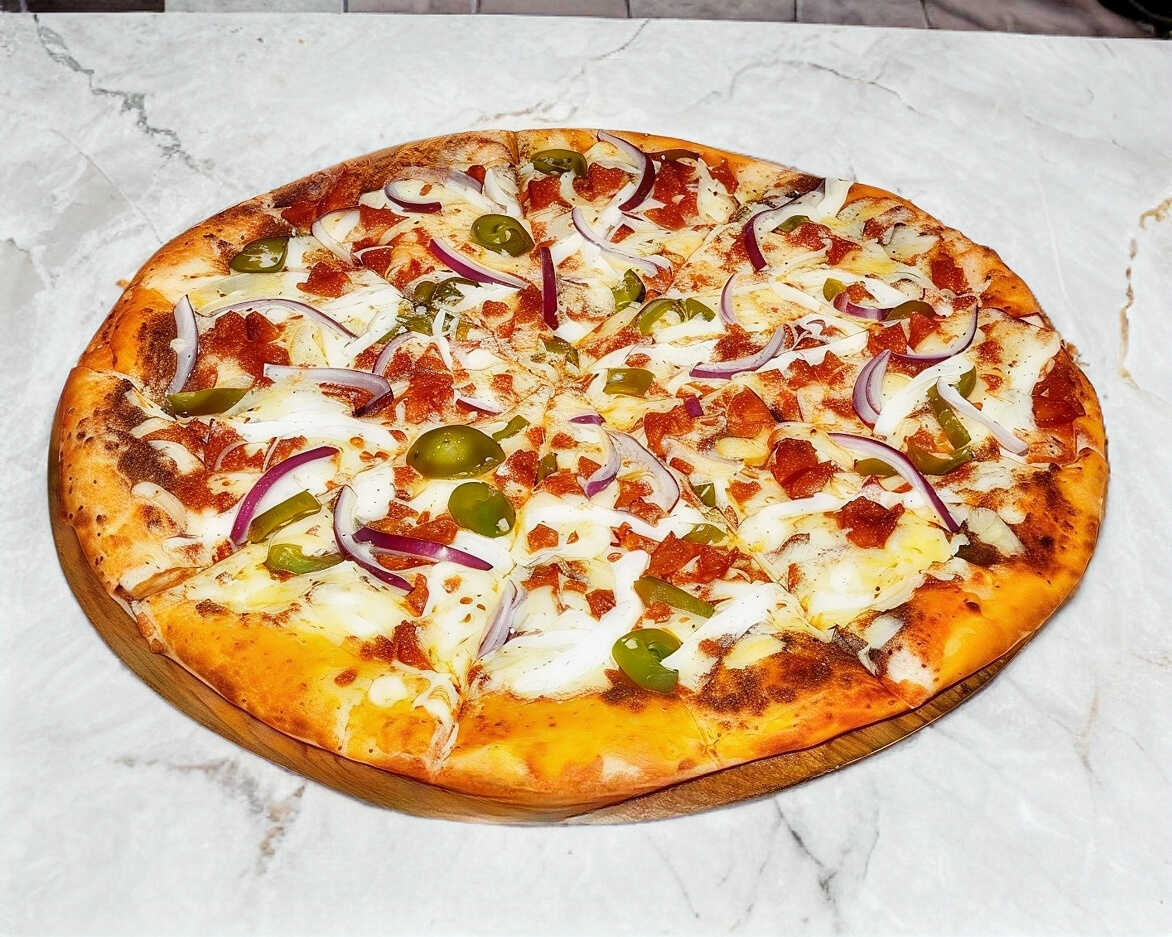 Jamón, chorizo, jitomate, cebolla, chiles y queso premium.