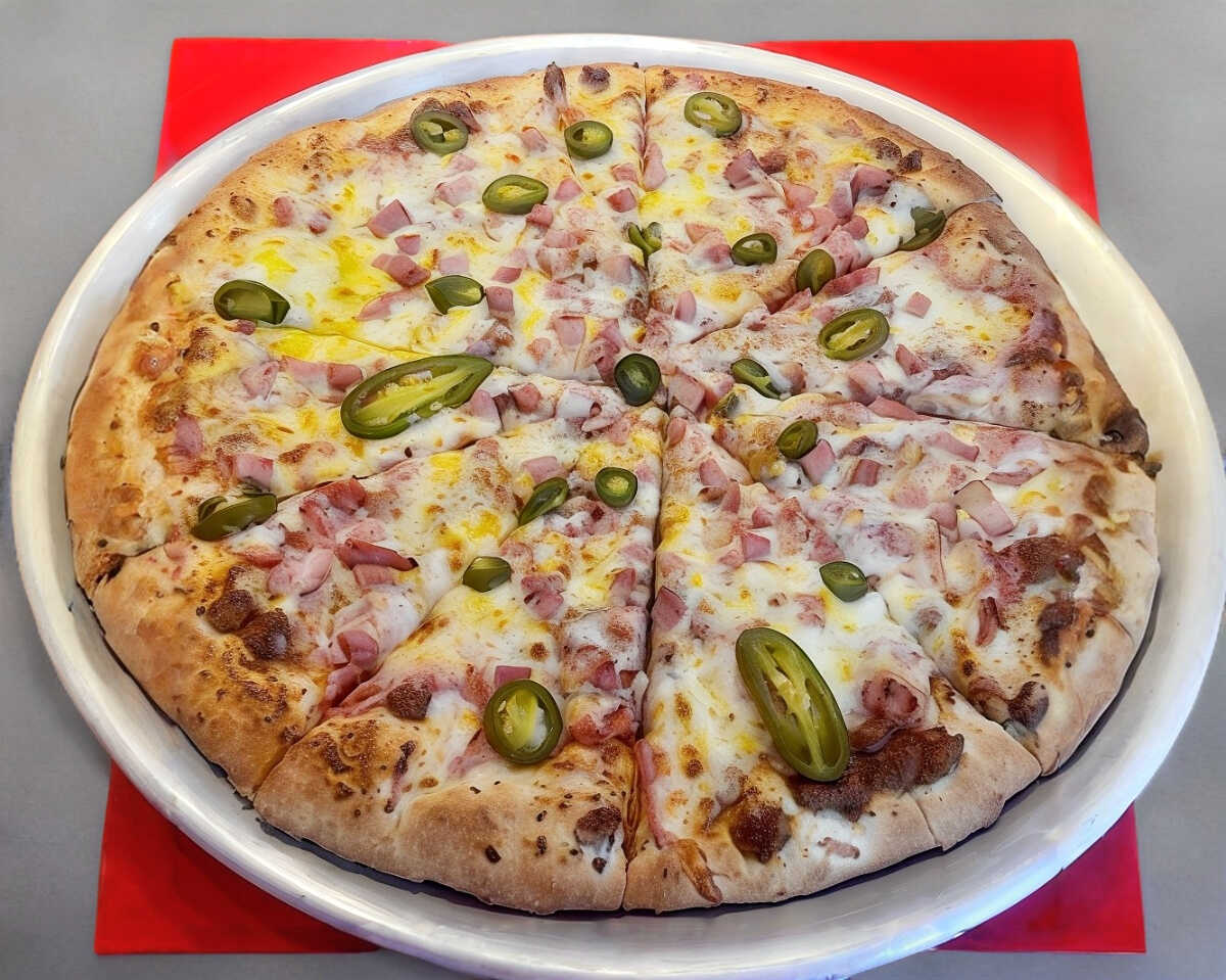 Pizza Grande Chorizo -salchicha -jamón -cebolla -chiles -frijol 9 rebanada