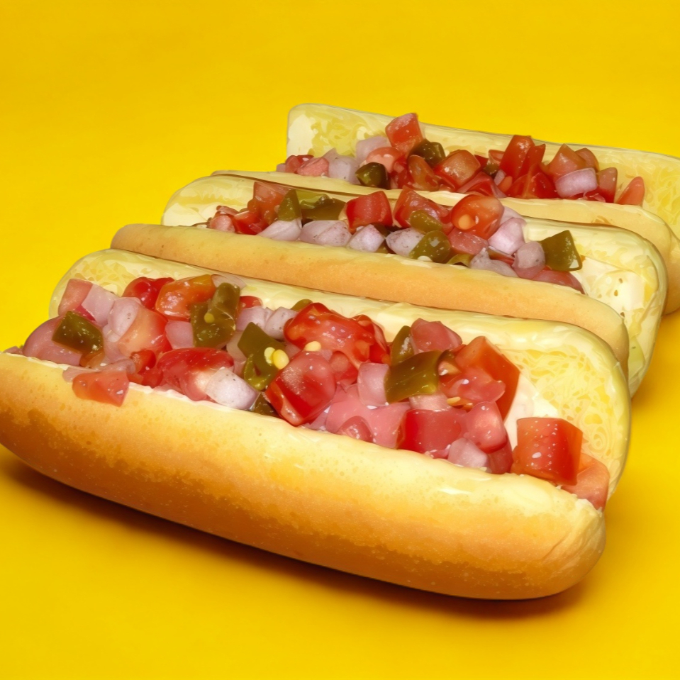 Tres hot dogs de salchicha de pavo, mayonesa y pico de gallo