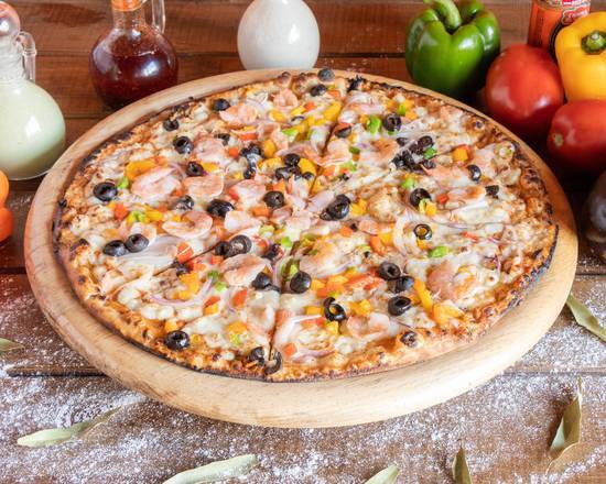 Queso mozzarella, salsa de tomate, camarones,pimientos, cebolla morada y aceituna negra