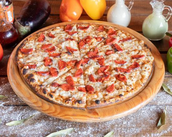 Queso mozzarella, salsa de tomate y chorizo almendrado.