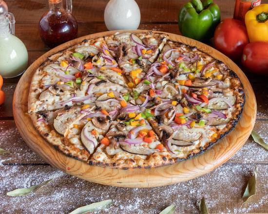 Queso mozzarella, salsa de tomate y pechuga de pollo en salsa BBQ,cebolla morada y pimientos