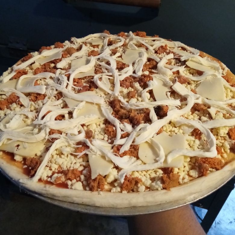 Queso base mozarella, queso manchego, chorizo y queso oaxaca.